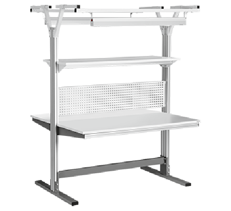 Oboustranný pracovní stůl s dvěma bočními hliníkovými rámy. pracovní deska je dodávána v sadě s dvojitým nižší rámem , oboustranný perforovaný panel , dvojité hlavní police a dvě svítidla .