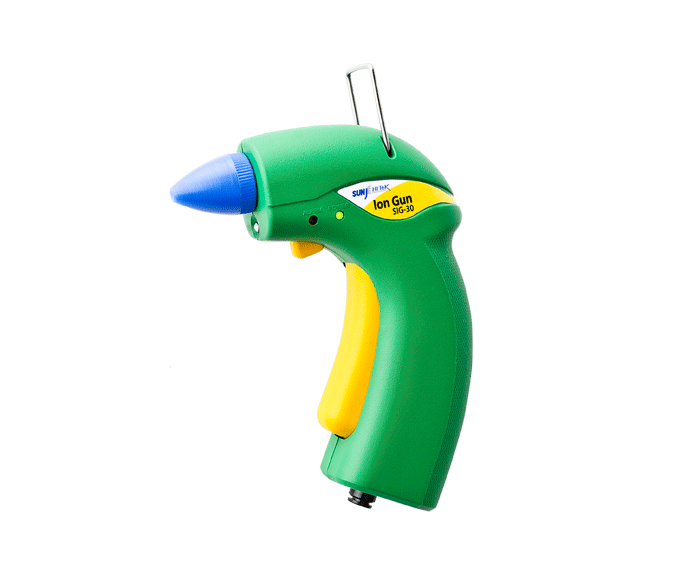 Ionizační pistole je lehká a mobilní, vhodná pro servisní pracoviště. Vyžaduje přívod vzduchu nebo zdroj stlačeného vzduchu. Má stabilní iontovou rovnováhu a proudem vzduchu také odstraňuje prach.